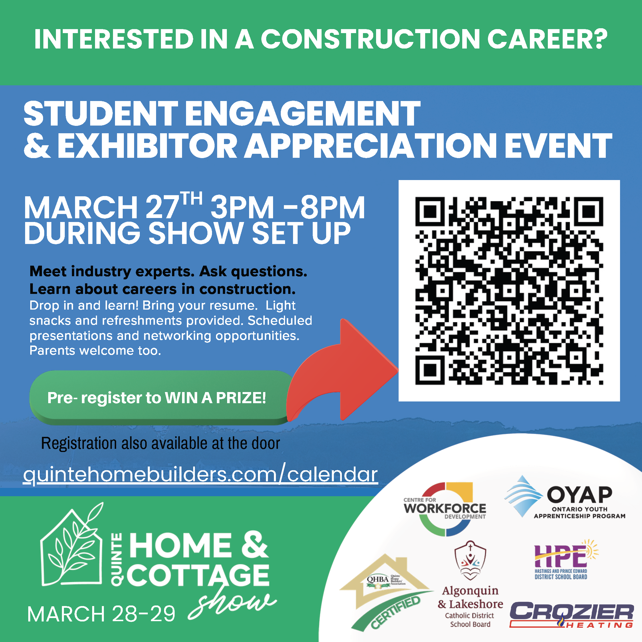 We look forward to welcoming you to the Show! Call us if you have any questions: QHBA (613) 970-2216 or via email at info@quintehomebuilders.com